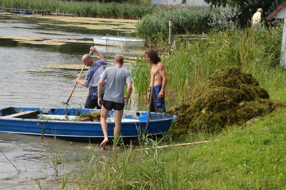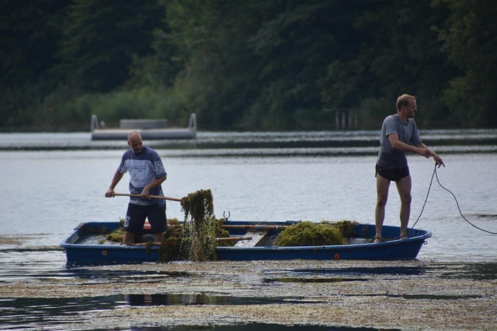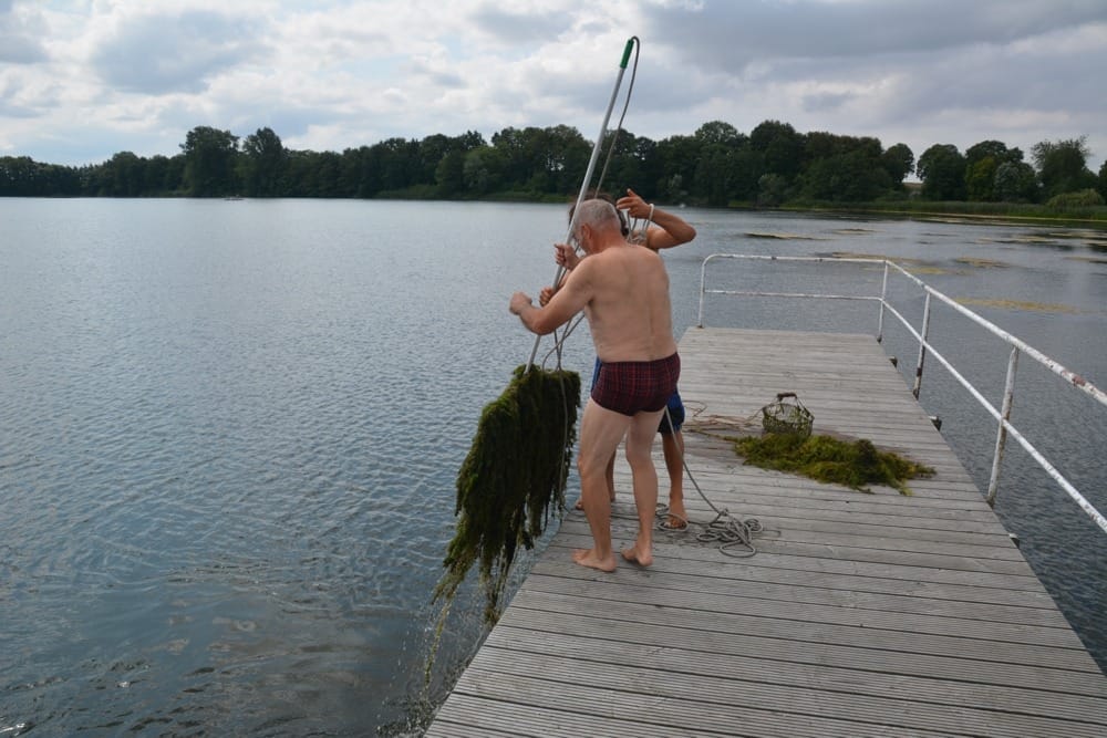 Nicht reden, machen! So das Motto von Alex, Jörn und Paul am Sonntag Mittag auf dem Kosenowsee. In mehr als 3 Stunden wurde der Berg mit Algen und Seegras der in Teppichform auf dem See treibt in beachtlicher Menge an Land geschafft. Mit nur einem Boot und 3 Leuten ein bisschen ein Kampf gegen Windmühlen aber vielleicht findet sich ja der Eine oder Andere und unterstützt die 3! Wir würden uns freuen! Benötigt würde eine Drahtkiepe (alte Kartoffelkiepe) mit einem längeren Seil oder eine Bootsbesatzung mit 2 Forken dann hätte die Sache sicher schneller ein Ende. Also wer Lust hat bitte melden!