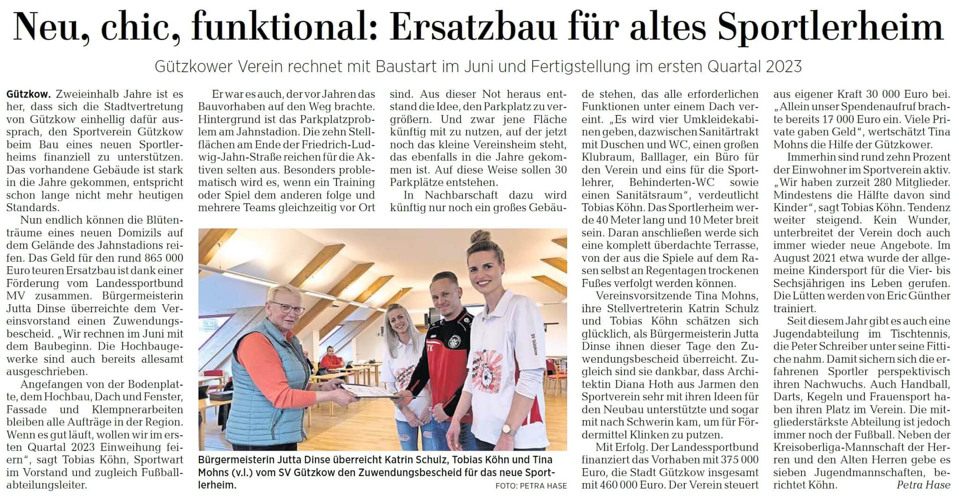 Am 7. April übergab Bürgermeisterin Jutta Dinse einen Zuwendungsbescheid in Höhe von 460.000 Euro an den Vorstand des SV Gützkow.